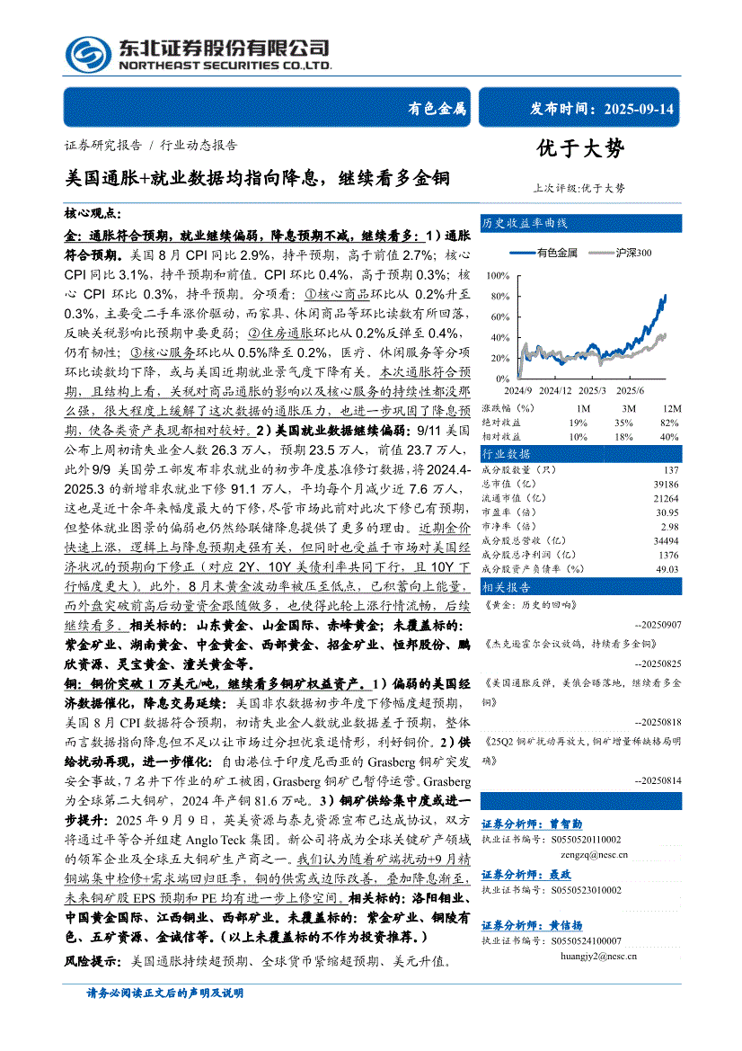 有色金属行业:东北证券-有色金属行业动态报告:美国通胀+就业数据均指向降息,继续看多金铜-250914