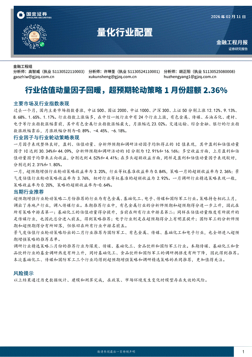 国金证券-量化行业配置:行业估值动量因子回暖,超预期轮动策略1月份超额2.36%-260211