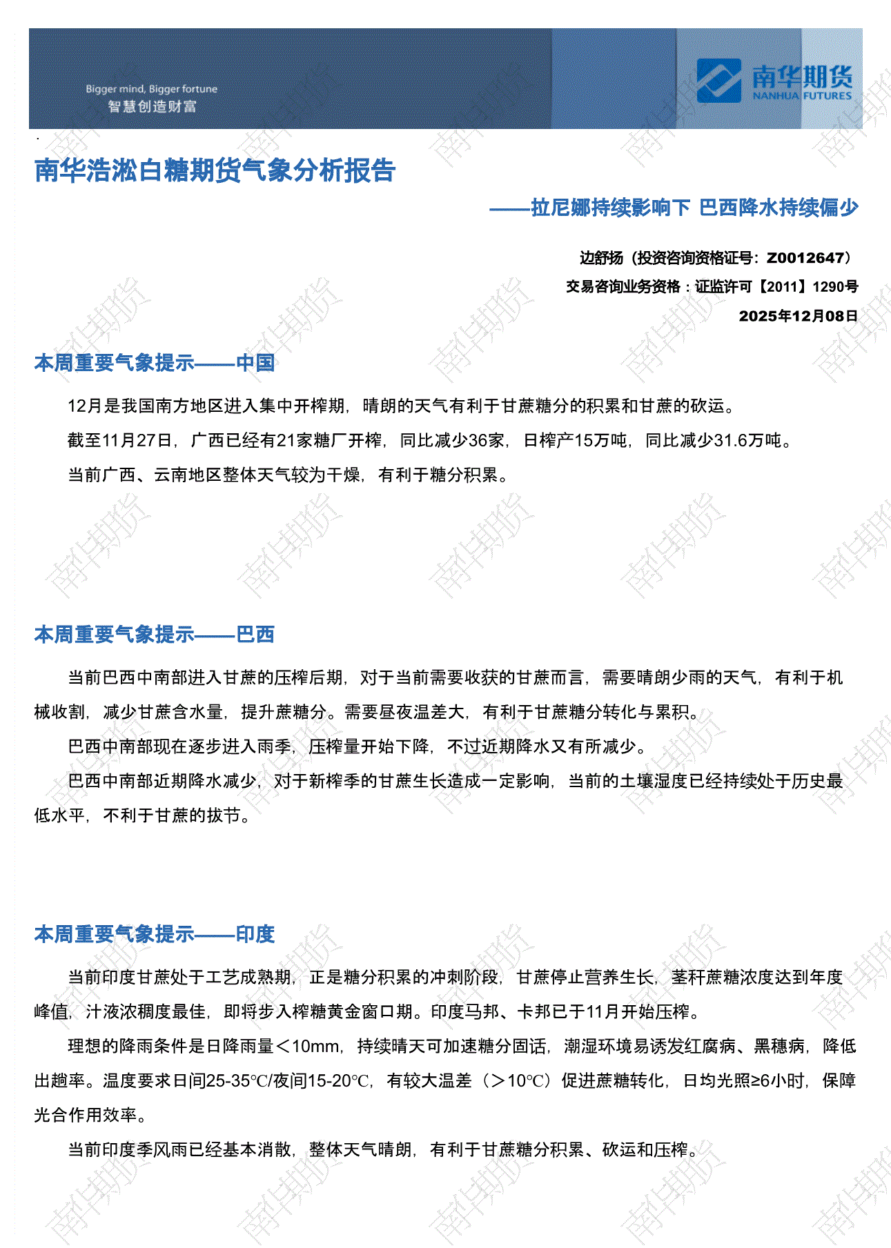 南华期货-浩淞白糖期货气象分析报告:拉尼娜持续影响下,巴西降水持续偏少-251208