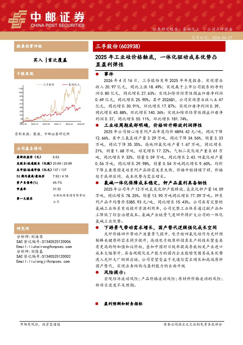 三孚股份:中邮证券-三孚股份-603938-2025年工业硅价格触底,一体化驱动成本优势凸显盈利弹性-260427