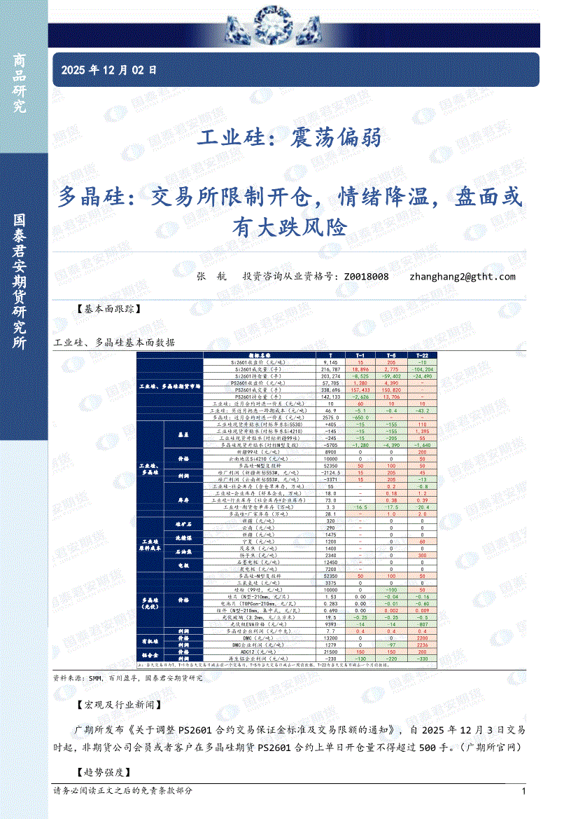 国泰君安期货-工业硅:震荡偏弱,多晶硅,交易所限制开仓,情绪降温,盘面或有大跌风险-251202