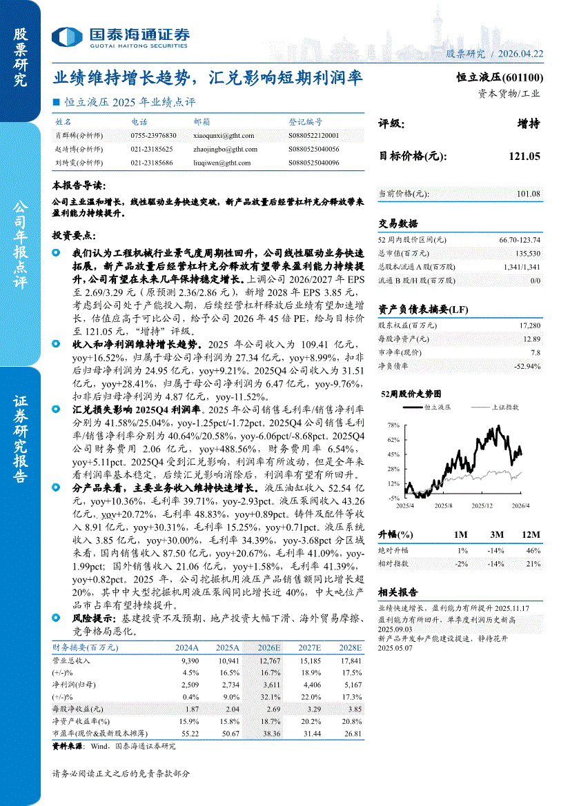 恒立液压:国泰海通证券-恒立液压-601100-2025年业绩点评:业绩维持增长趋势,汇兑影响短期利润率-260422