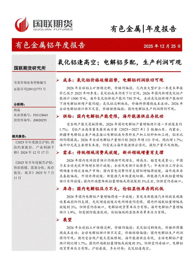 国联期货-有色金属铝年度报告:氧化铝逢高空;电解铝多配,生产利润可观-251225