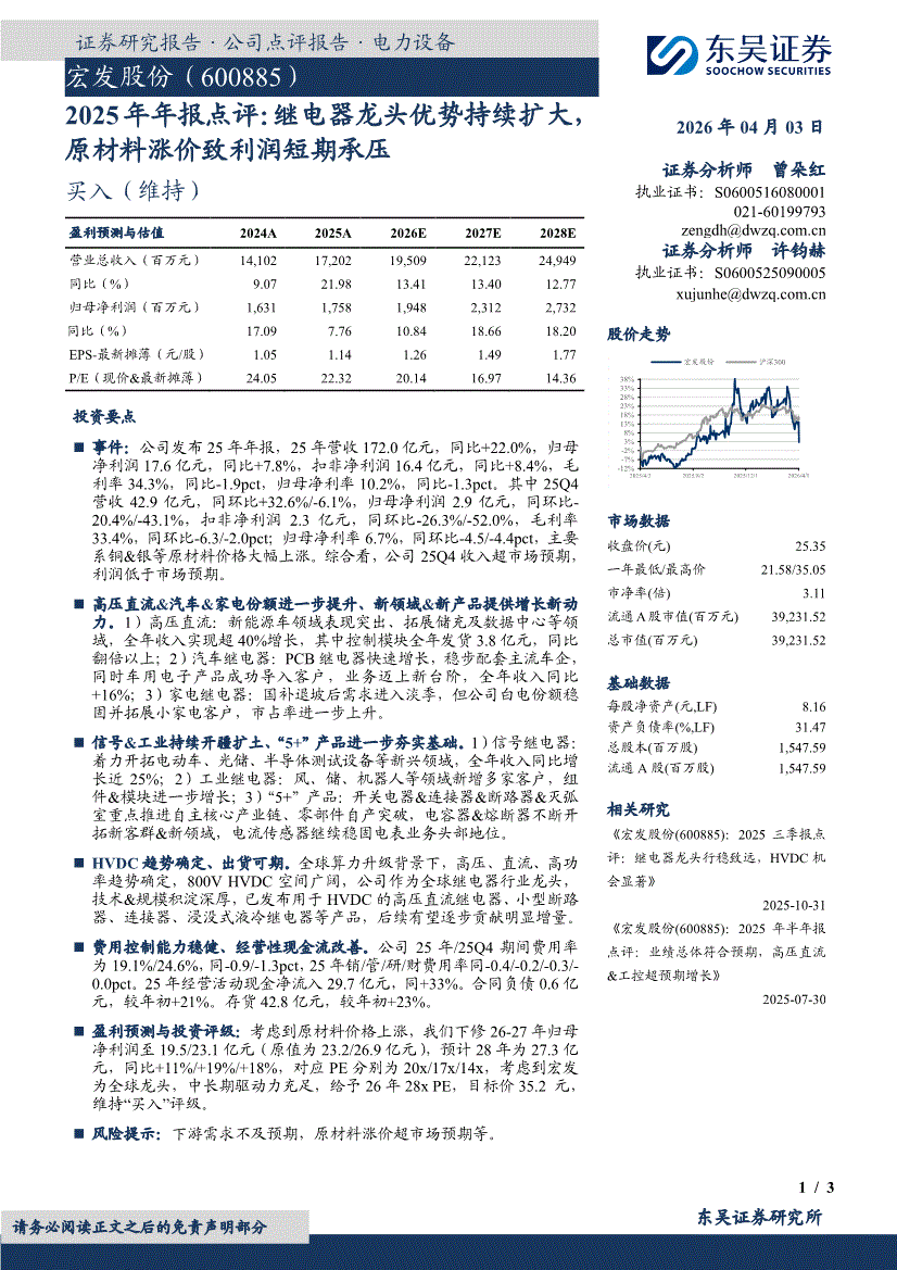 宏发股份:东吴证券-宏发股份-600885-2025年年报点评:继电器龙头优势持续扩大,原材料涨价致利润短期承压-260403