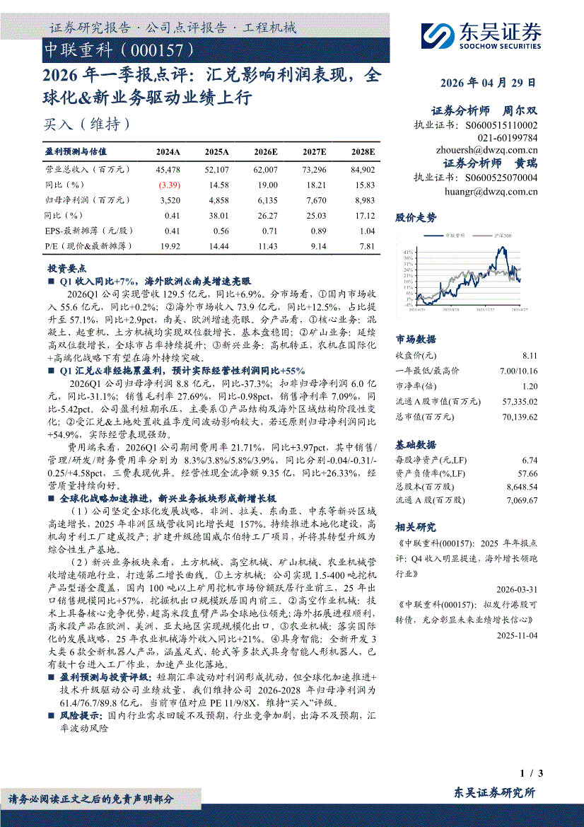 东吴证券-中联重科-000157-2026年一季报点评:汇兑影响利润表现,全球化&新业务驱动业绩上行-260429