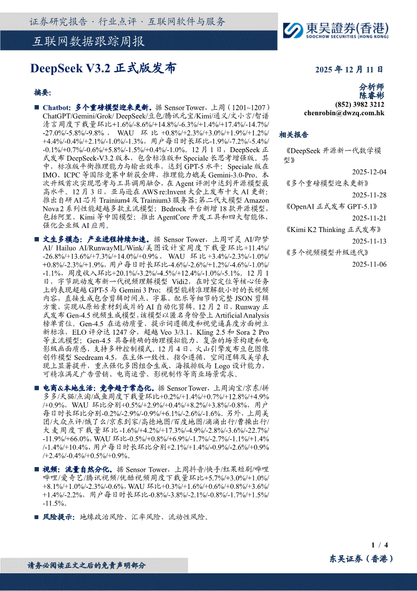 互联网行业:东吴证券(香港)-互联网行业数据跟踪周报:DeepSeek V3.2正式版发布-251211