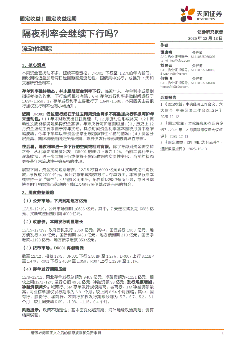 天风证券-流动性跟踪:隔夜利率会继续下行吗?-251213