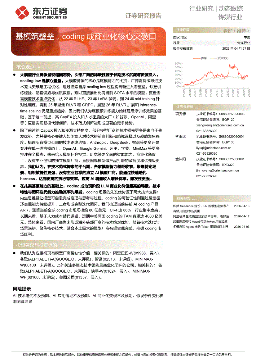 传媒行业:东方证券-传媒行业动态跟踪:基模筑壁垒,coding成商业化核心突破口-260427