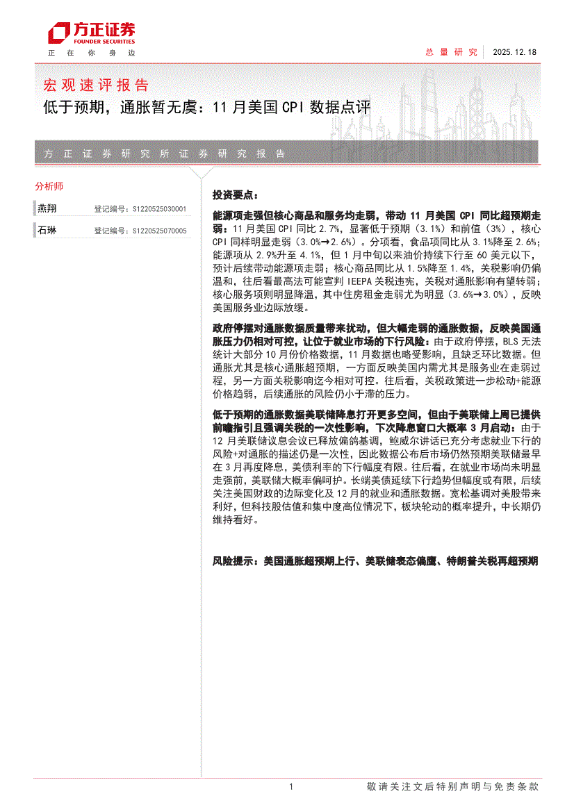 方正证券-宏观速评报告:低于预期,通胀暂无虞,11月美国CPI数据点评-251218
