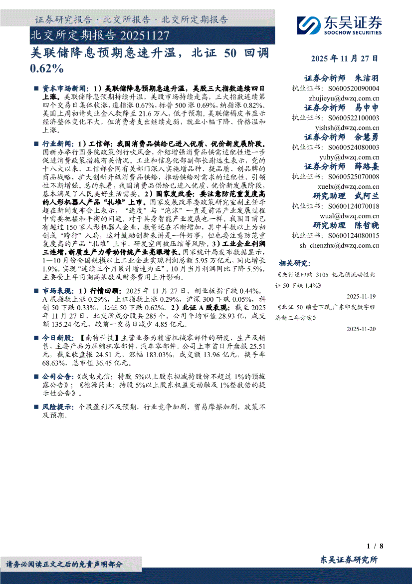 东吴证券-北交所定期报告:美联储降息预期急速升温,北证50回调0.62%-251127