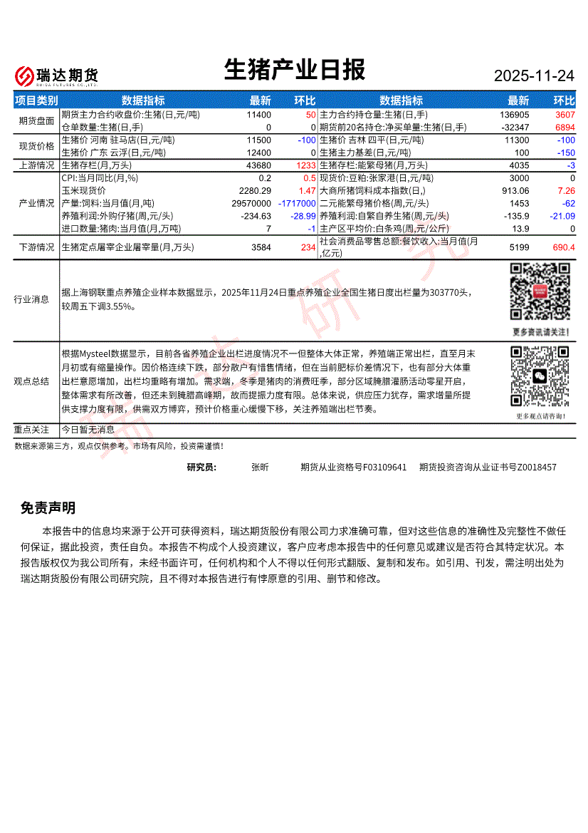 瑞达期货-生猪市场周报:基本面偏弱,限制价格走势-251107