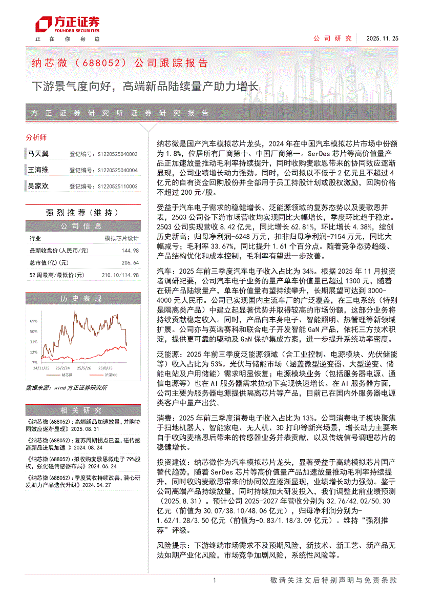 纳芯微:方正证券-纳芯微-688052-公司跟踪报告:下游景气度向好,高端新品陆续量产助力增长-251125