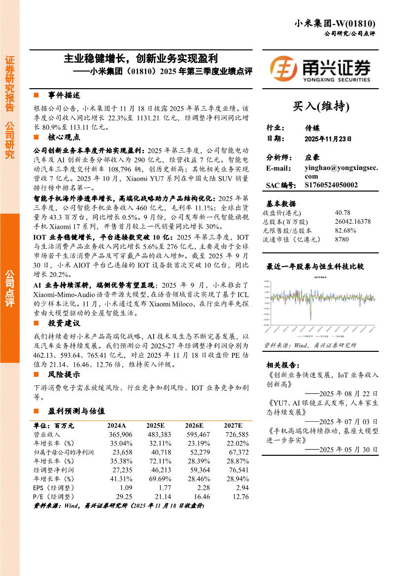小米集团:甬兴证券-小米集团-1810.HK-2025年第三季度业绩点评:主业稳健增长,创新业务实现盈利-251123