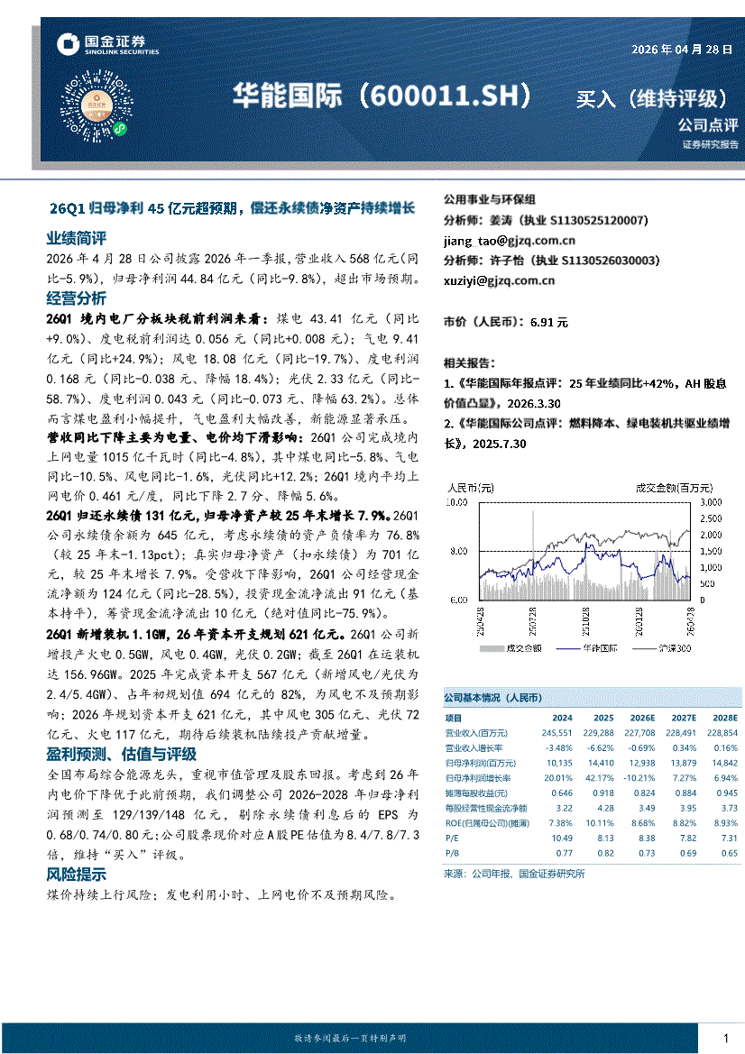 国金证券-华能国际-600011-26Q1归母净利45亿元超预期,偿还永续债净资产持续增长-260428