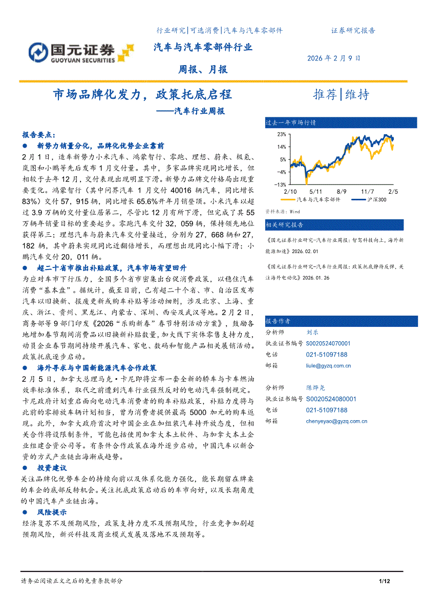 汽车行业:国元证券-汽车行业周报:市场品牌化发力,政策托底启程-260209
