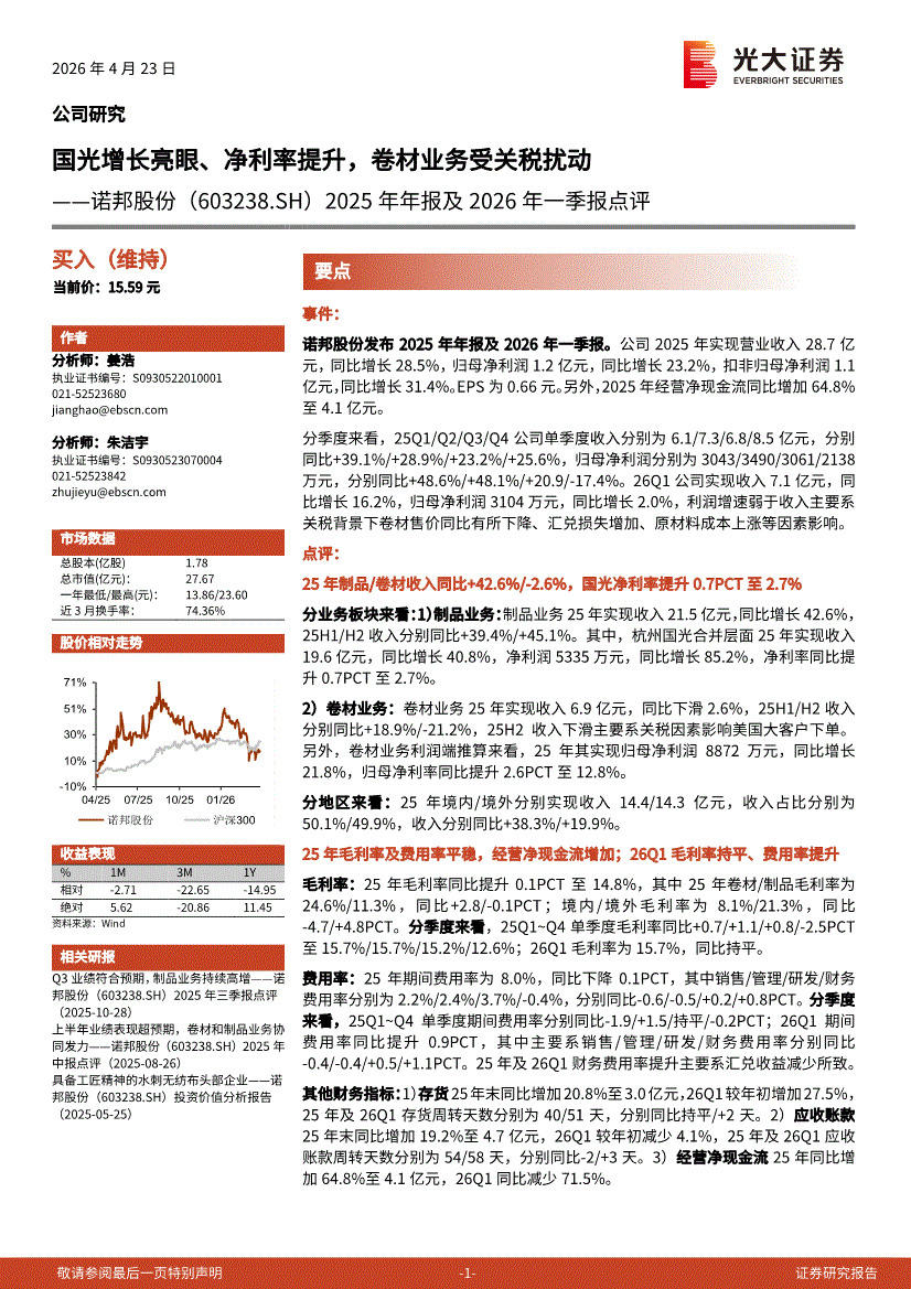 诺邦股份:光大证券-诺邦股份-603238-2025年年报及2026年一季报点评:国光增长亮眼、净利率提升,卷材业务受关税扰动-260423
