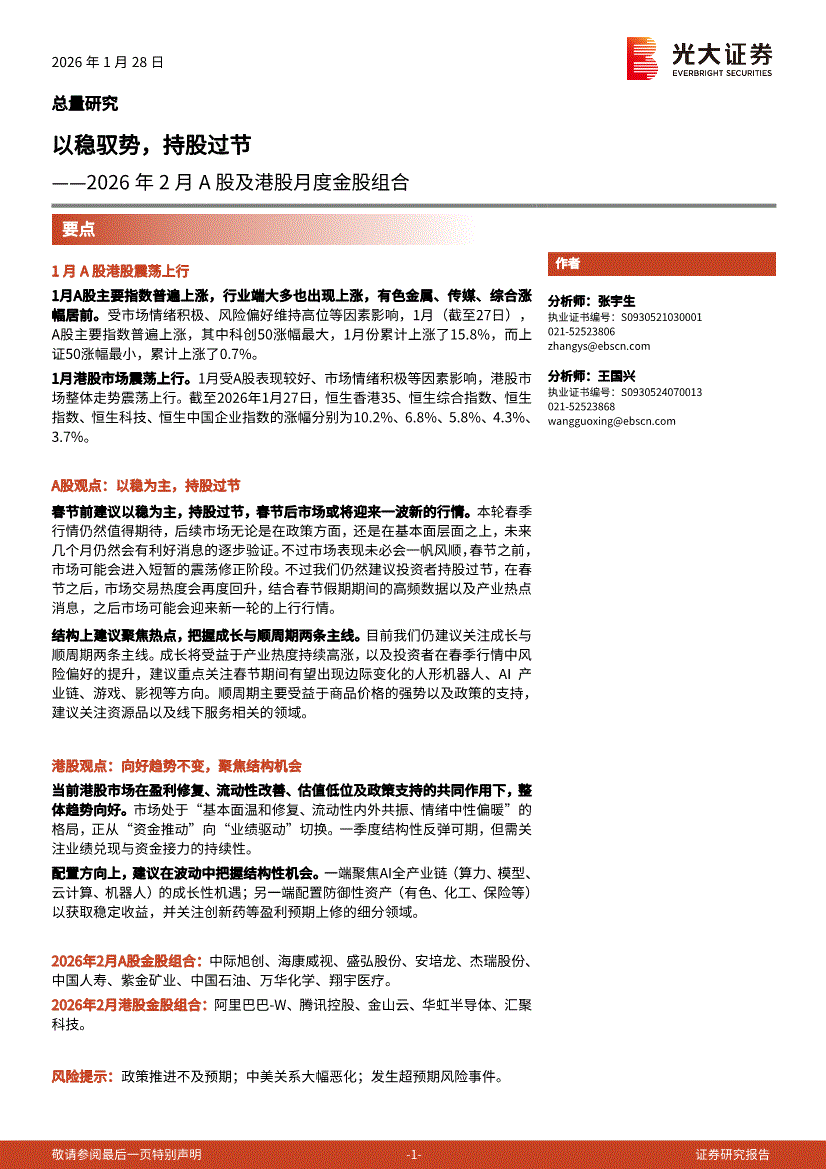 光大证券-2026年2月A股及港股月度金股组合:以稳驭势,持股过节-260128