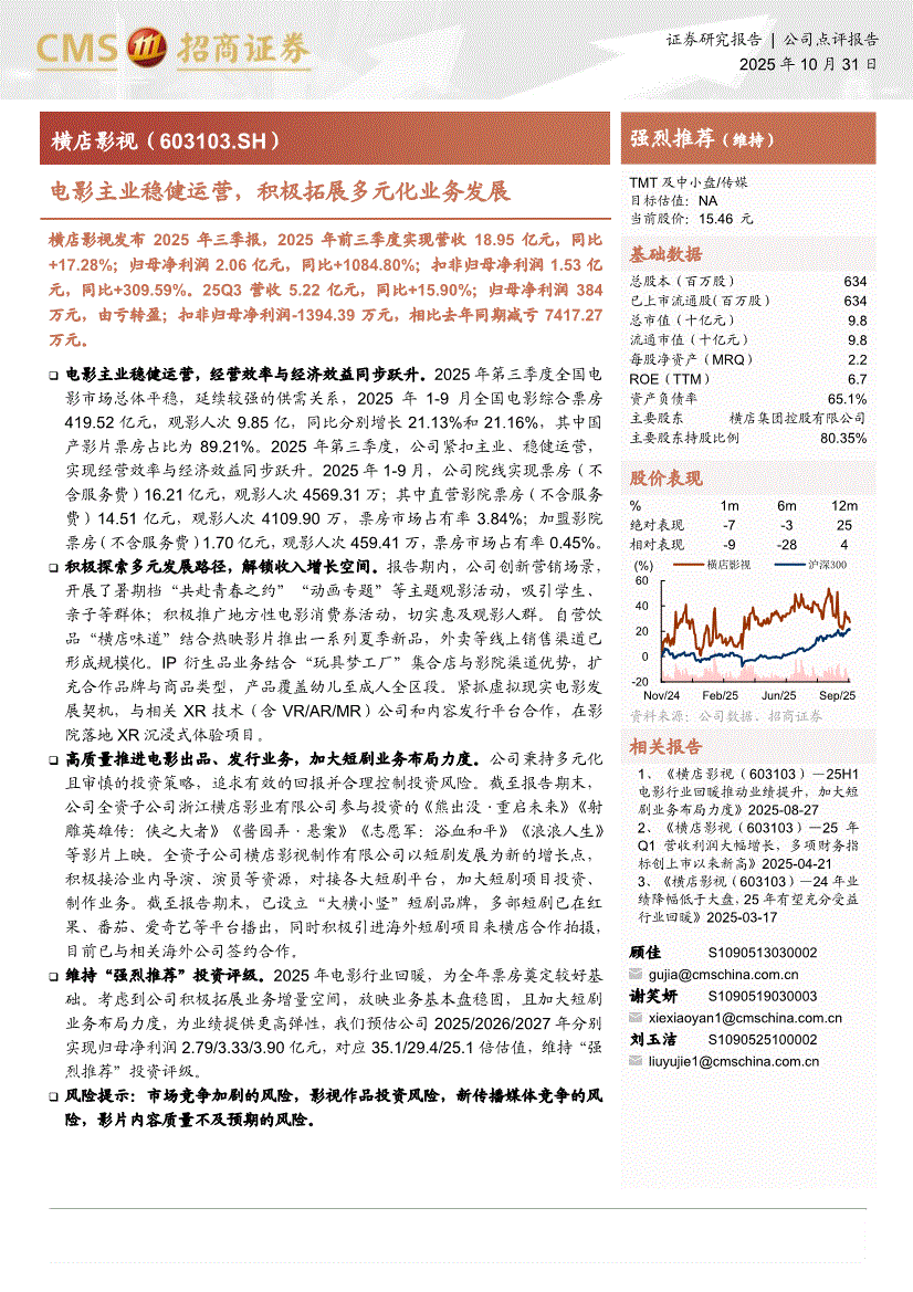 横店影视:招商证券-横店影视-603103-电影主业稳健运营,积极拓展多元化业务发展-251031