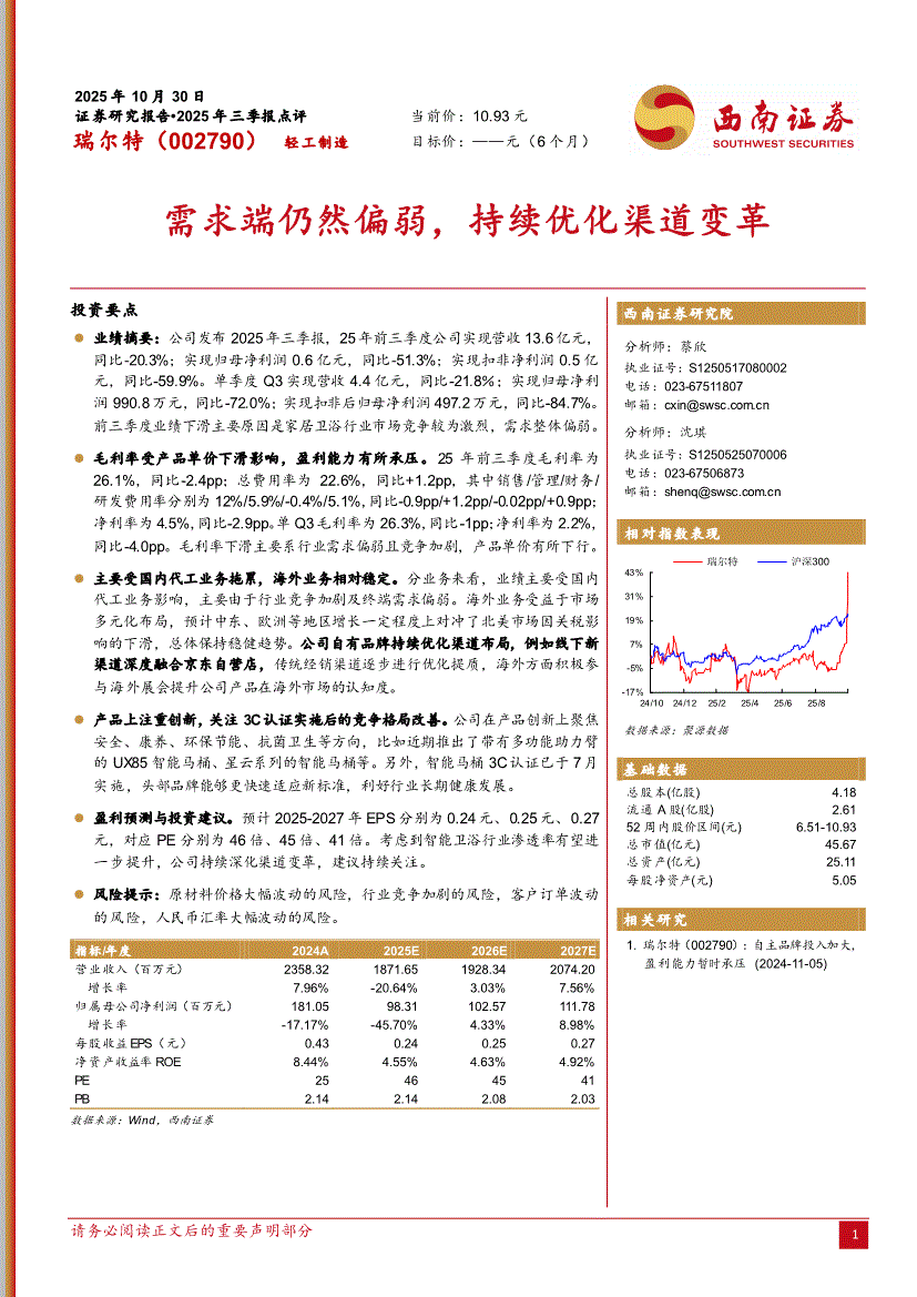 瑞尔特:西南证券-瑞尔特-002790-需求端仍然偏弱,持续优化渠道变革-251030