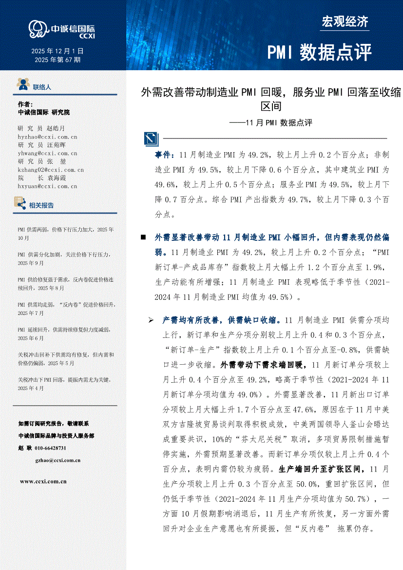 中诚信国际-11月PMI数据点评:外需改善带动制造业PMI回暖,服务业PMI回落至收缩区间-251201