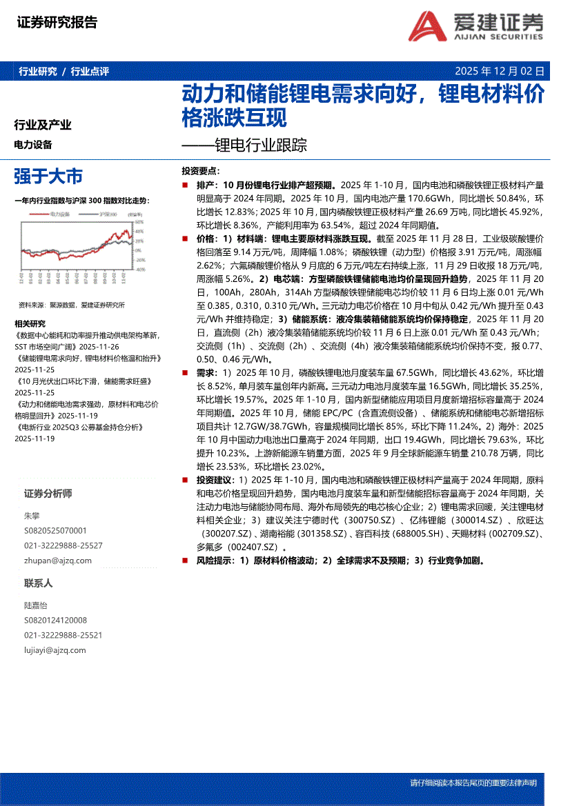 锂电行业:爱建证券-锂电行业跟踪:动力和储能锂电需求向好,锂电材料价格涨跌互现-251202