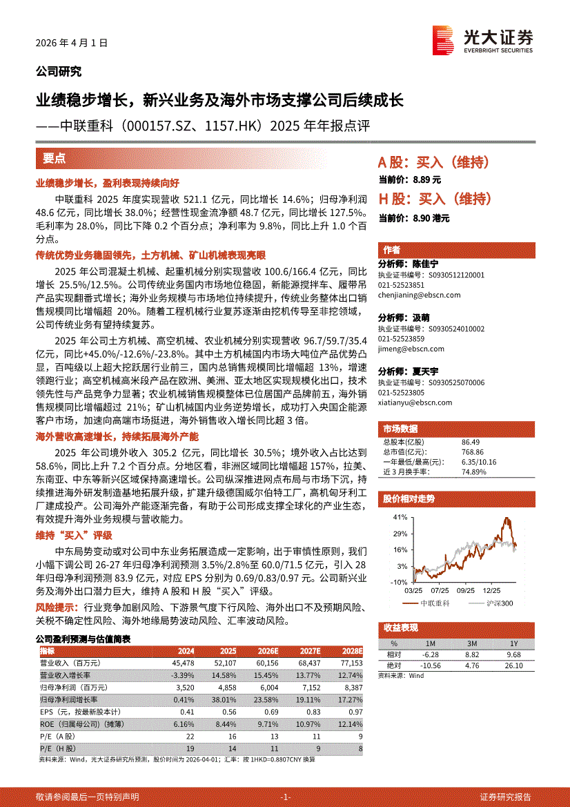 中联重科:光大证券-中联重科-000157-2025年年报点评:业绩稳步增长,新兴业务及海外市场支撑公司后续成长-260401