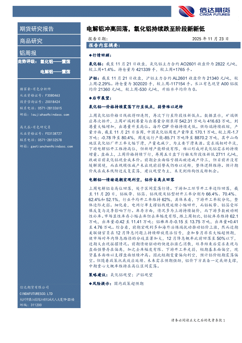 信达期货-铝周报:电解铝冲高回落,氧化铝持续跌至阶段新新低-251123