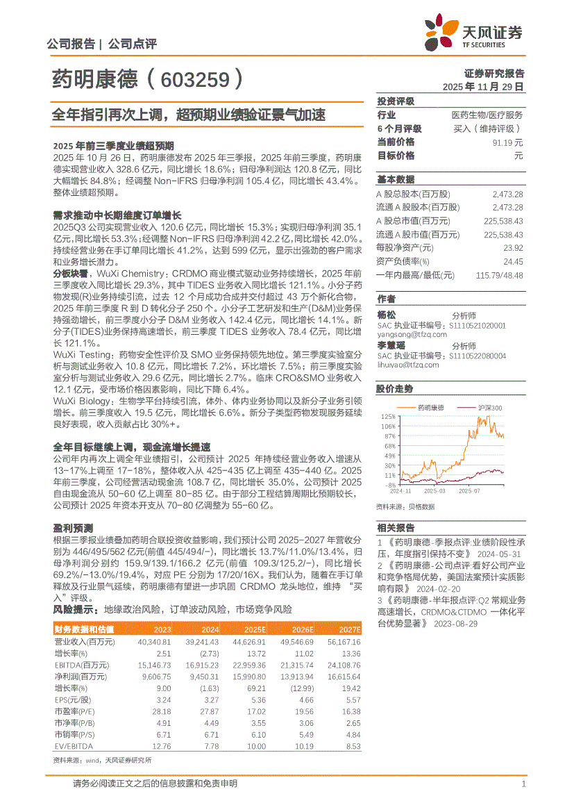 药明康德:天风证券-药明康德-603259-全年指引再次上调,超预期业绩验证景气加速-251129