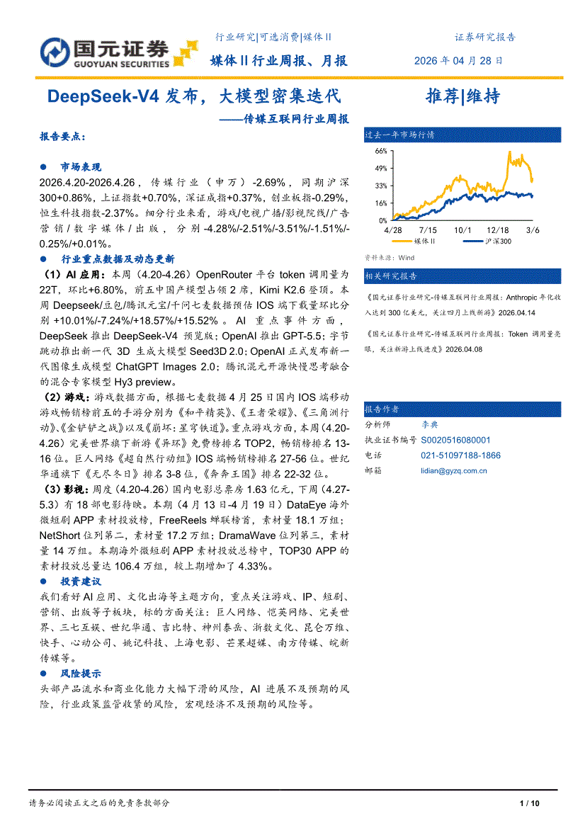 传媒互联网行业:国元证券-传媒互联网行业周报:DeepSeek~V4发布,大模型密集迭代-260428