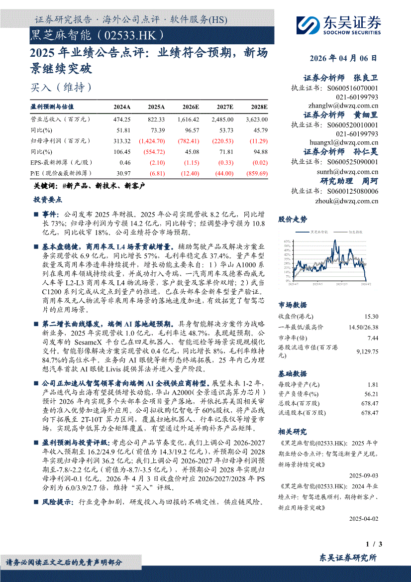 黑芝麻智能:东吴证券-黑芝麻智能-2533.HK-2025年业绩公告点评:业绩符合预期,新场景继续突破-260406