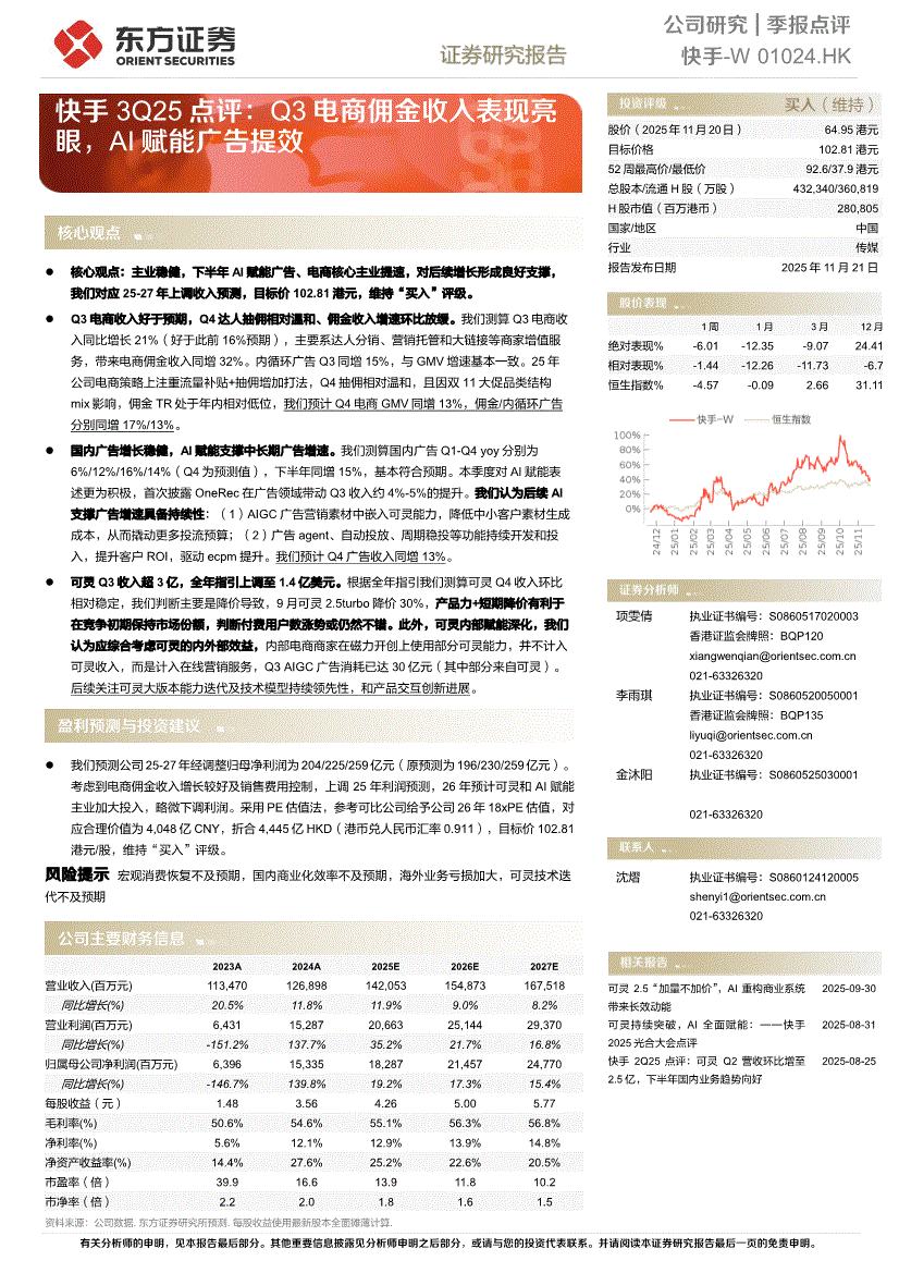 快手~W:东方证券-快手~W-1024.HK-3Q25点评:Q3电商佣金收入表现亮眼,AI赋能广告提效-251121