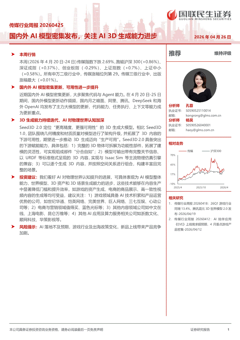 传媒行业:国联民生证券-传媒行业周报:国内外AI模型密集发布,关注AI 3D生成能力进步-260426