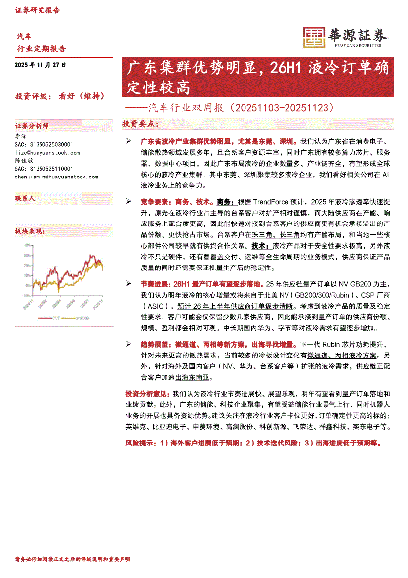 汽车行业:华源证券-汽车行业双周报:广东集群优势明显,26H1液冷订单确定性较高-251127