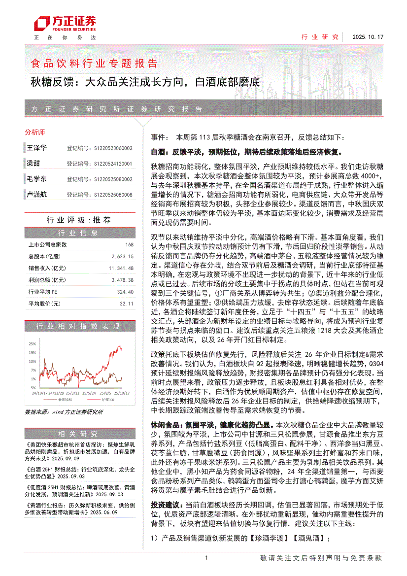 食品饮料行业:方正证券-食品饮料行业专题报告:秋糖反馈,大众品关注成长方向,白酒底部磨底-251017