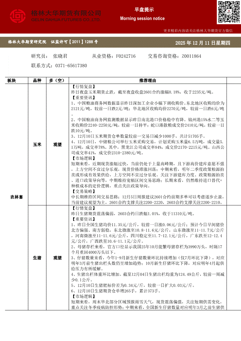 格林大华期货-玉米生猪鸡蛋早盘提示-251127