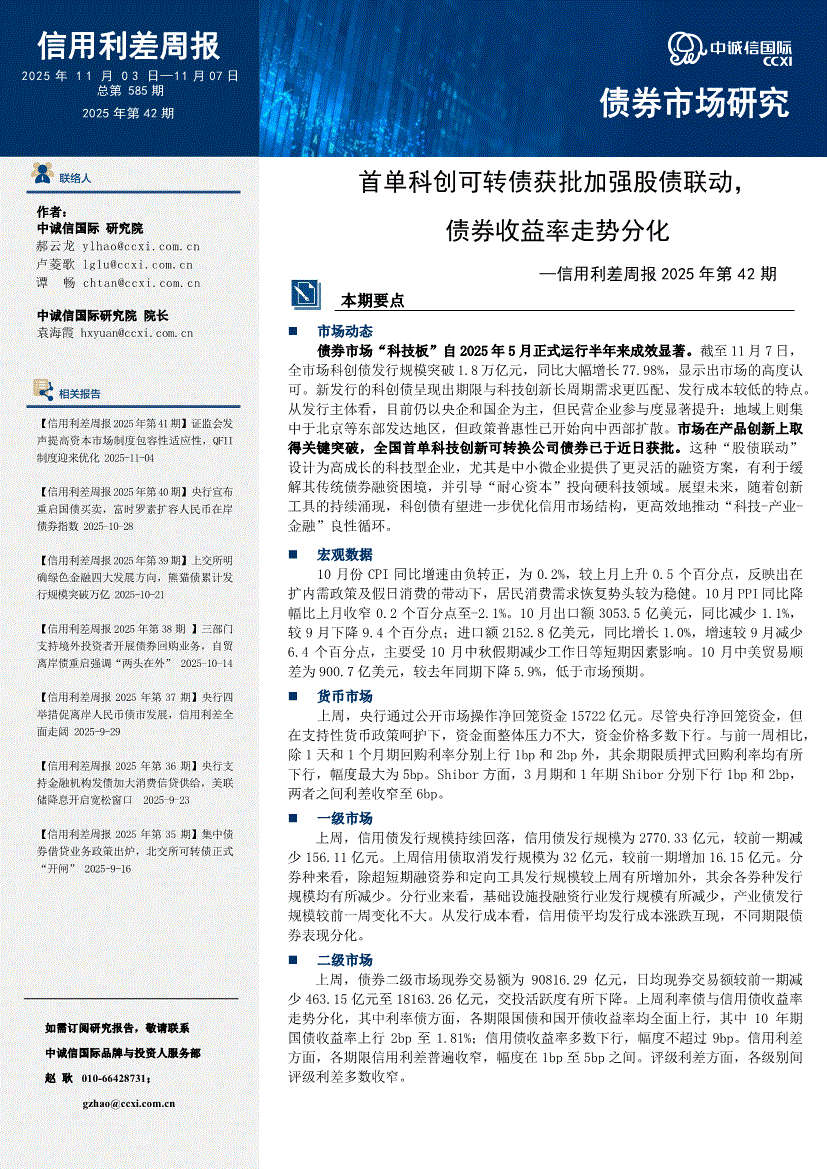 中诚信国际-信用利差周报2025年第42期:首单科创可转债获批加强股债联动,债券收益率走势分化-251113