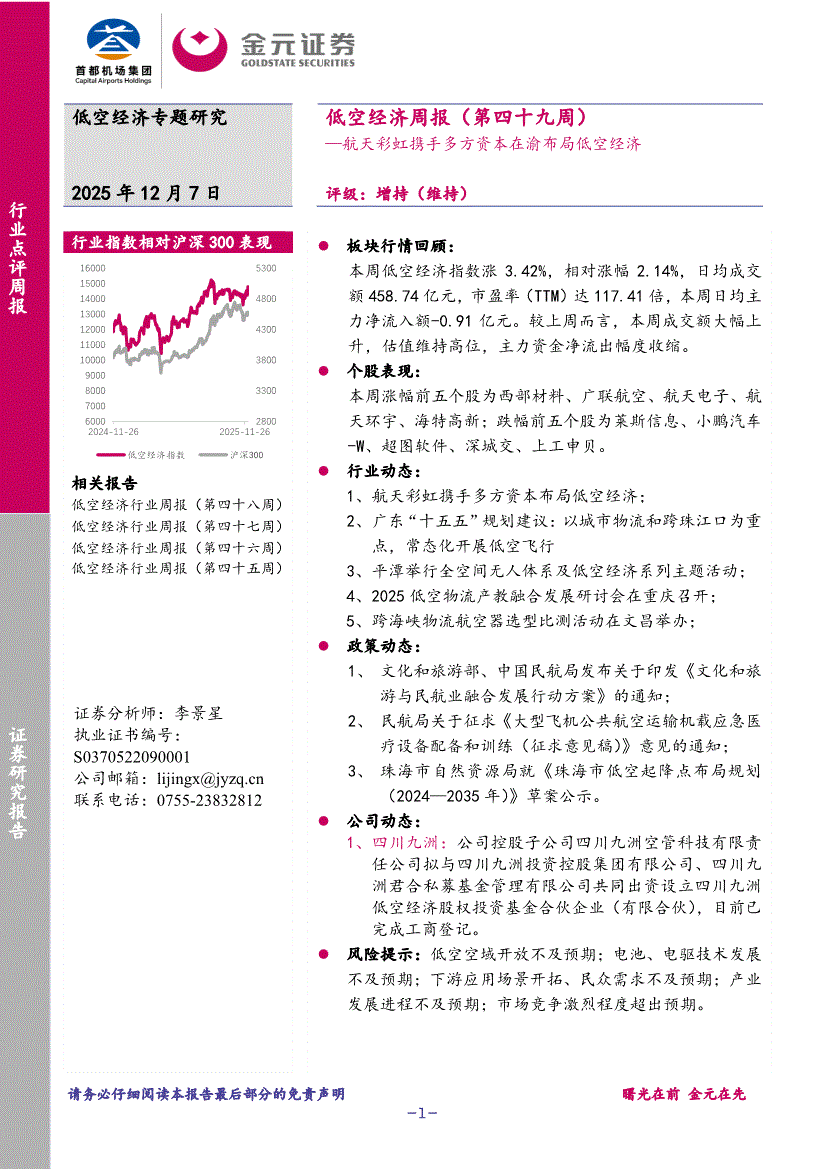 低空经济行业:金元证券-低空经济行业周报(第四十九周):航天彩虹携手多方资本在渝布局低空经济-251207