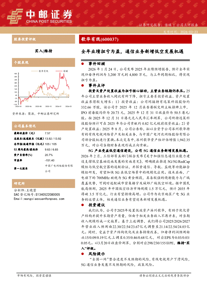 歌华有线:中邮证券-歌华有线-600037-全年业绩扭亏为盈,通信业务新增低空发展机遇-260323