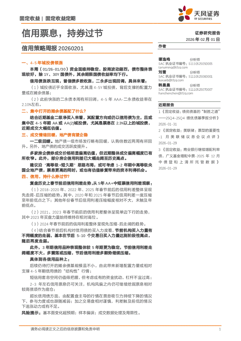 天风证券-信用策略周报:信用票息,持券过节-260201