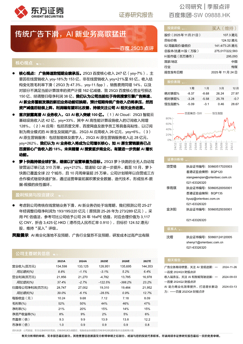 百度集团~SW:东方证券-百度集团~SW-9888.HK-25Q3点评:传统广告下滑,AI新业务高歌猛进-251124