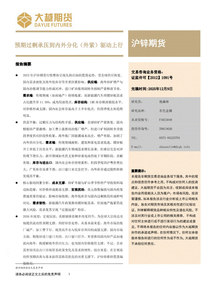 大越期货-沪锌期货年度报告:预期过剩承压到内外分化(外紧)驱动上行-251209