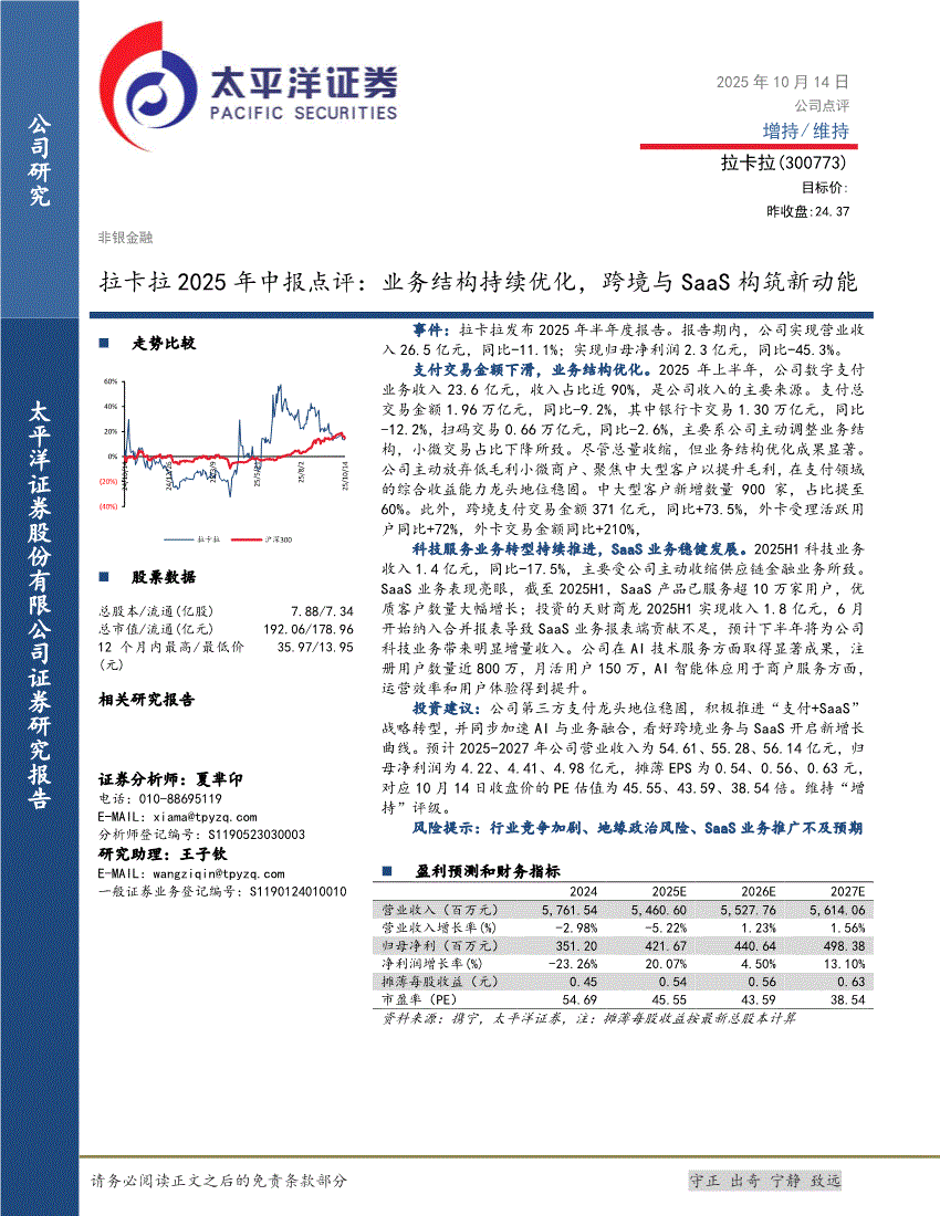 太平洋证券-拉卡拉-300773-2025年中报点评:业务结构持续优化,跨境与SaaS构筑新动能-251014