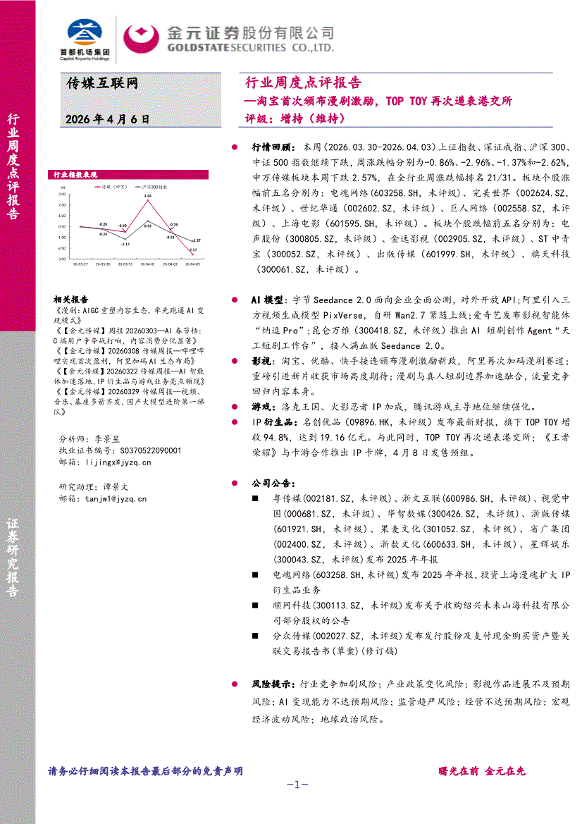 传媒互联网行业:金元证券-传媒互联网行业周度点评报告:淘宝首次颁布漫剧激励,TOP TOY再次递表港交所-260406