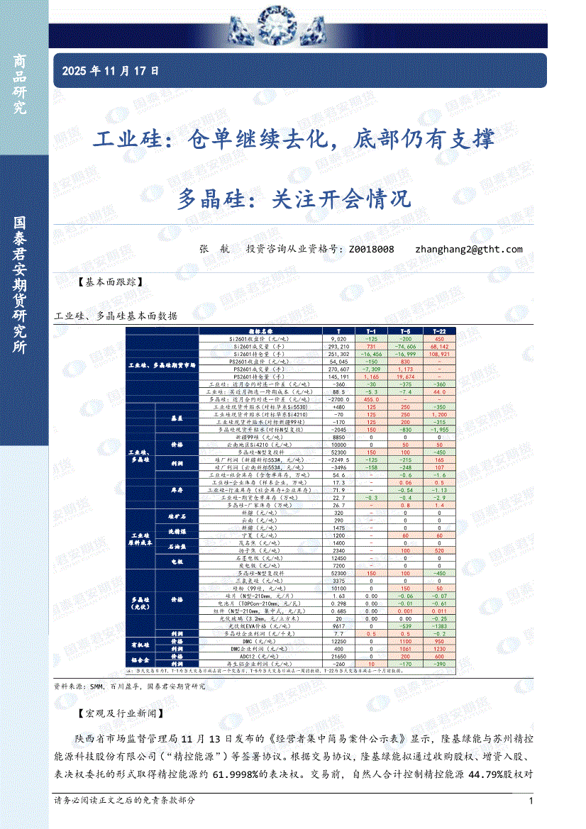 国泰君安期货-工业硅:仓单继续去化,底部仍有支撑,多晶硅,关注开会情况-251117
