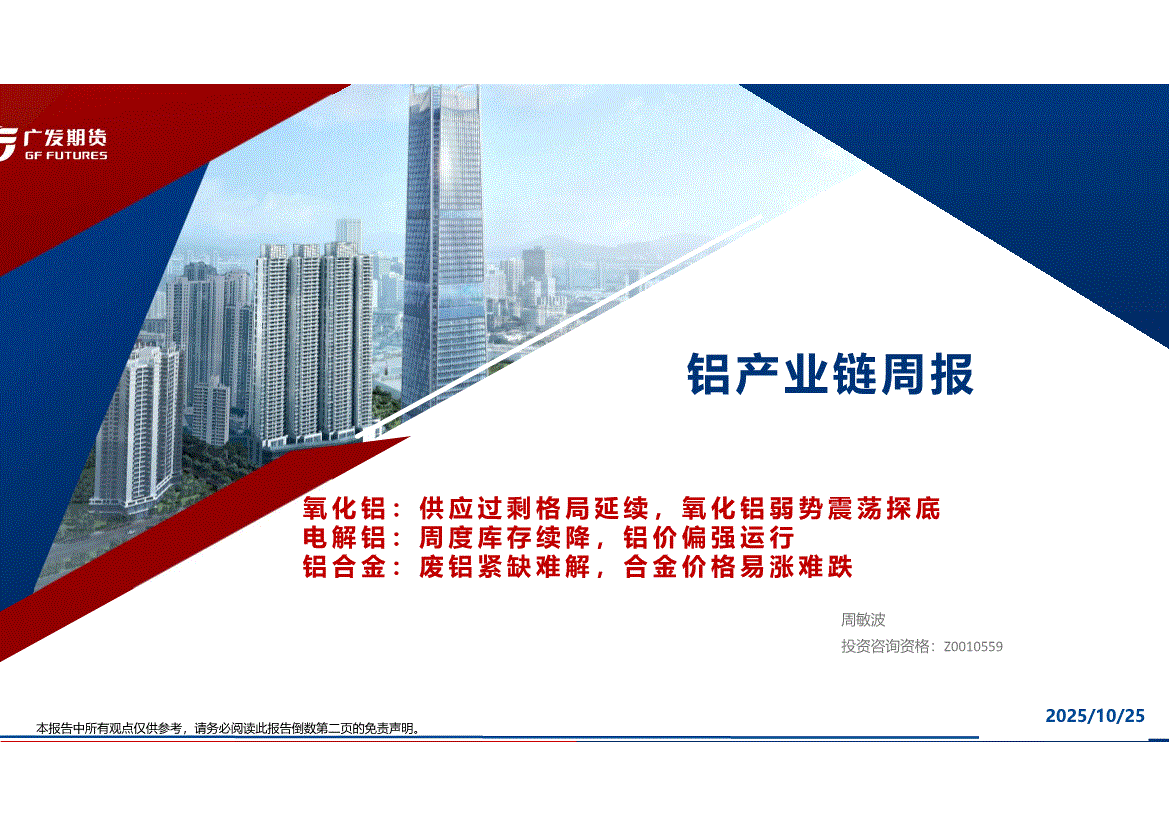 广发期货-铝产业链周报:氧化铝,供应过剩格局延续,氧化铝弱势震荡探底,电解铝,周度库存续降,铝价偏强运行,铝合金,废铝紧缺难解,合金价格易涨难跌-251025