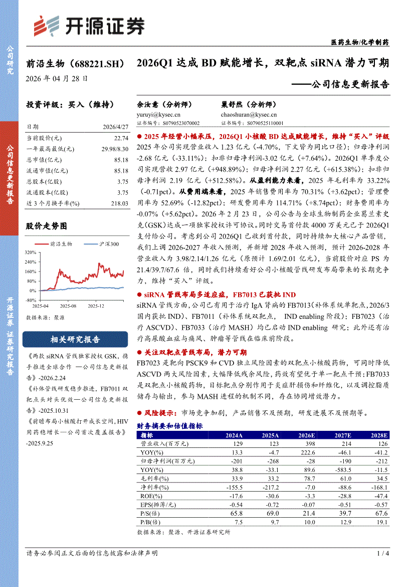 前沿生物:开源证券-前沿生物-688221-公司信息更新报告:2026Q1达成BD赋能增长,双靶点siRNA潜力可期-260428