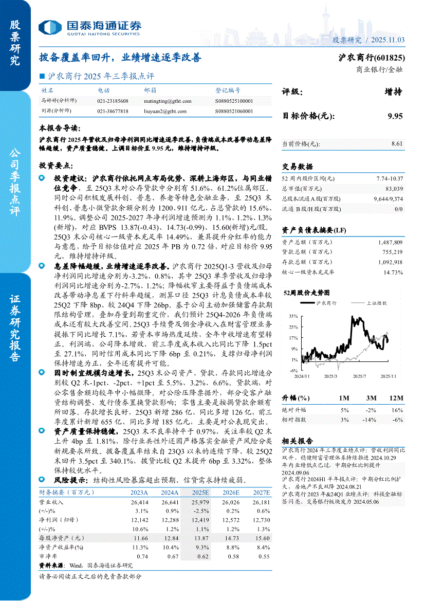 沪农商行:国泰海通证券-沪农商行-601825-2025年三季报点评:拨备覆盖率回升,业绩增速逐季改善-251103