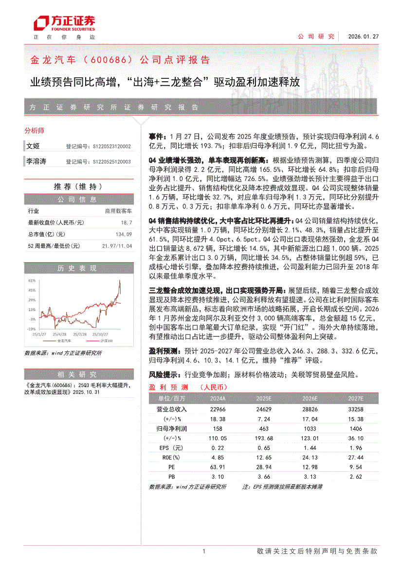 金龙汽车:方正证券-金龙汽车-600686-公司点评报告:业绩预告同比高增,“出海+三龙整合”驱动盈利加速释放-260127