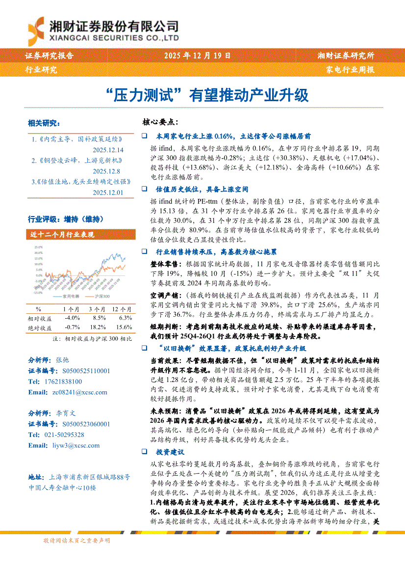 家电行业:湘财证券-家电行业周报:“压力测试”有望推动产业升级-251219