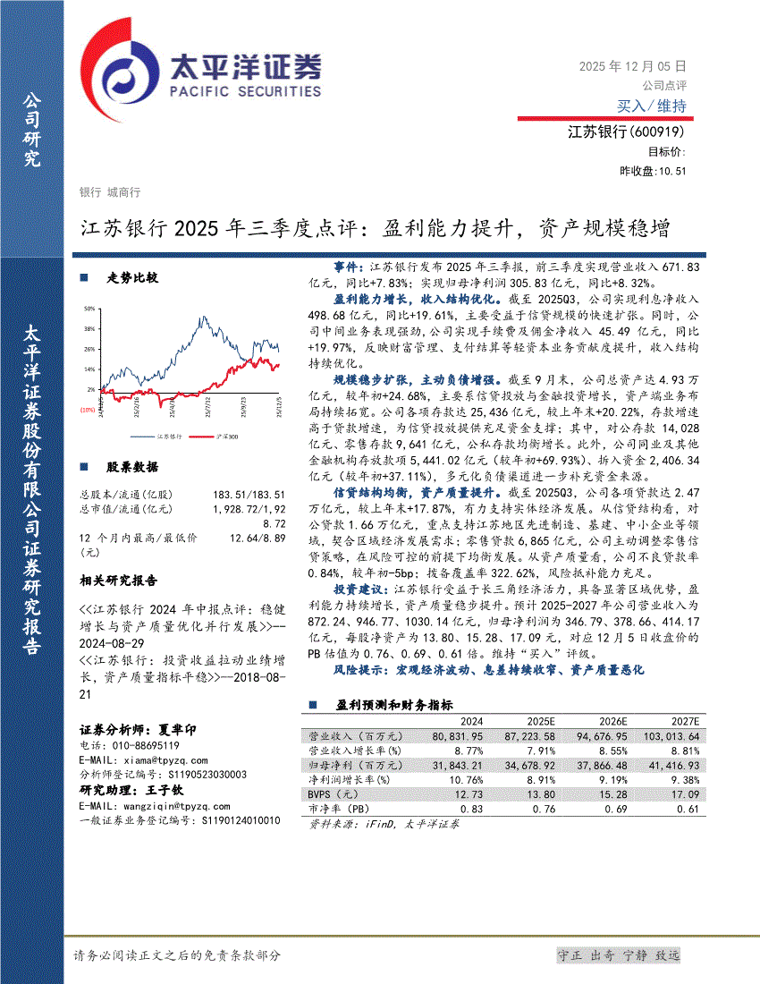 江苏银行:太平洋证券-江苏银行-600919-2025年三季度点评:盈利能力提升,资产规模稳增-251205